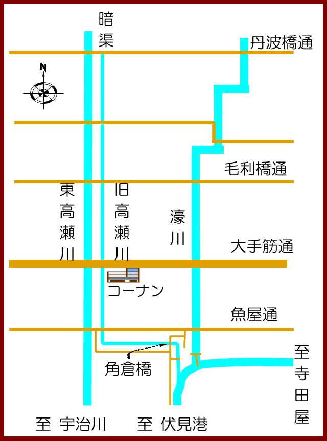 高瀬川開削以前は大阪からの物資は淀川から鴨川の流れに乗って上り、鳥羽付近(平時は水量が少ないため)で陸揚げされ陸路で京都市内へ運ばれました。
